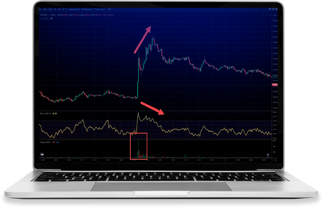 Резкий всплеск объёма — на гистограмме появляется аномально высокий столбик, что сигнализирует о повышенном интересе к активу и возможном развороте.